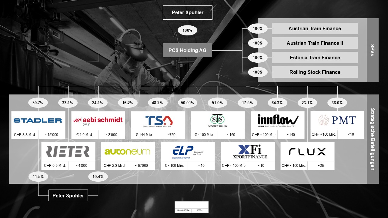 Peter Spuhler hält privat weitere Aktienanteile, u.a. 11.5% an der Stadler Rail AG und 10.4% an Aebi Schmidt.